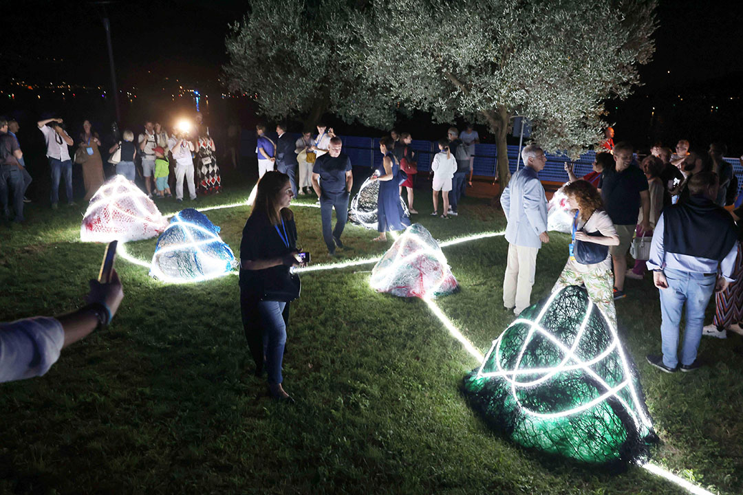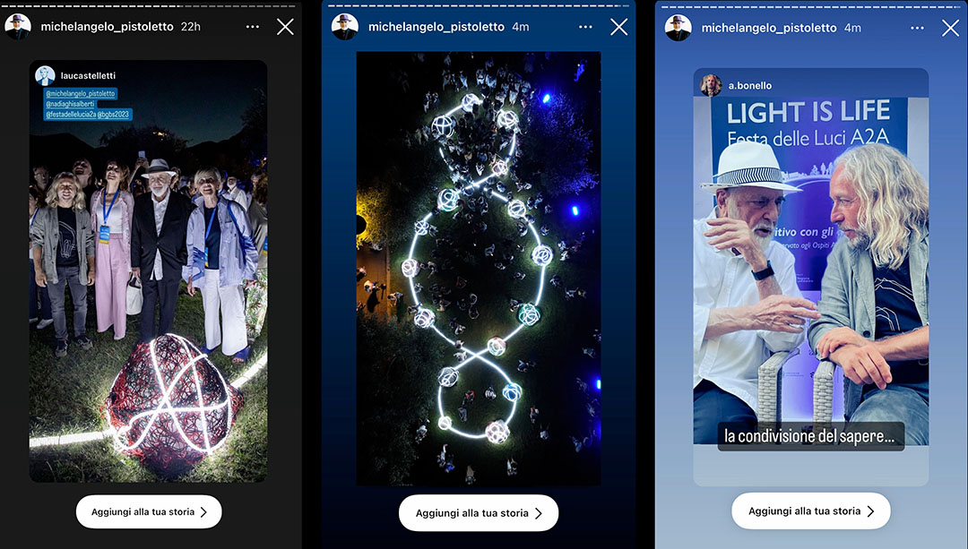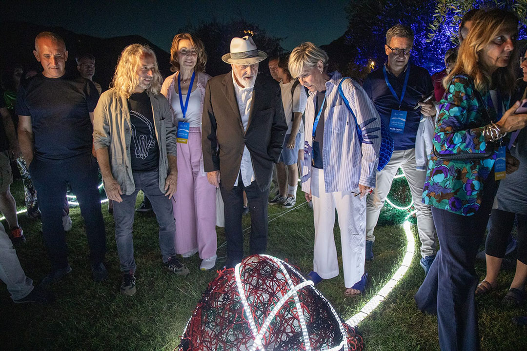 It is a joint artwork by Michelangelo Pistoletto and Angelo Bonello, curatorship by Fortunato D’Amico, created in Monte Isola, on July 2023, with re-used materials, disused LED lights and nets produced on the island.